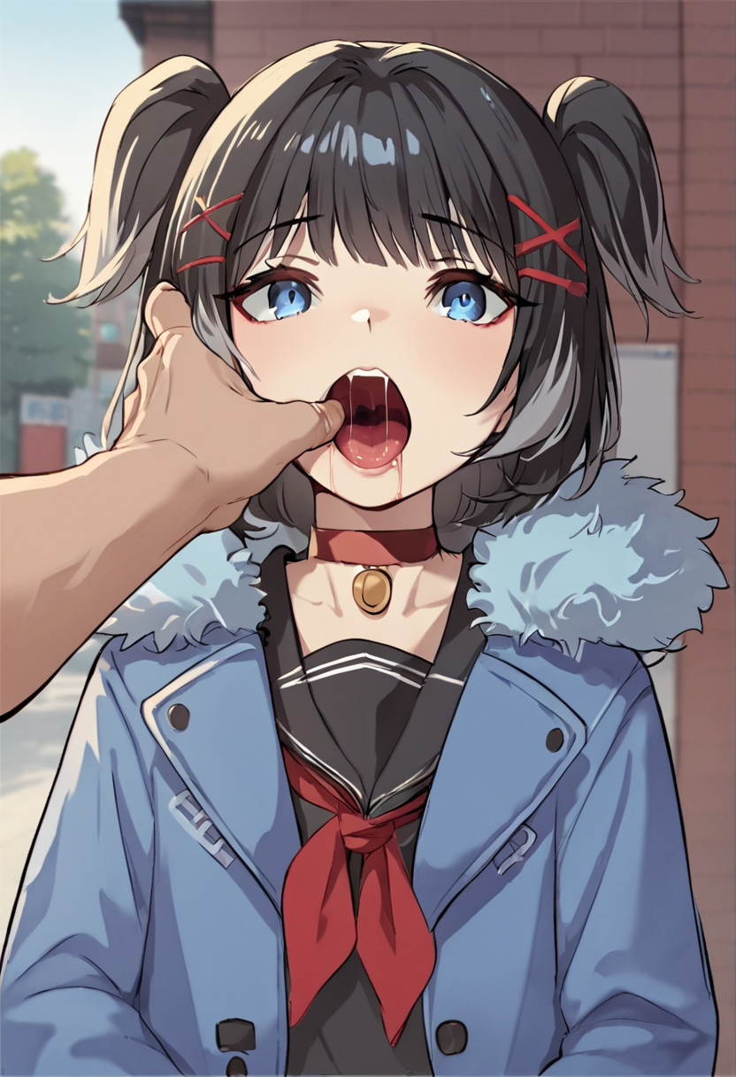 tag : 1girl, sen(djmax), hair ornament, black hair, hairclip, short hair, blue eyes, two side up, blue coat, black serafuku, red neckerchief, black skirt