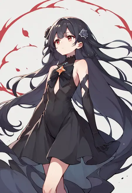タグ:rose(djmax)、ロングヘア、1girl、黒髪、赤い目、ドレス、黒いドレス、肩出し、花、黒い手袋、肘まで覆う手袋、おへそカバー