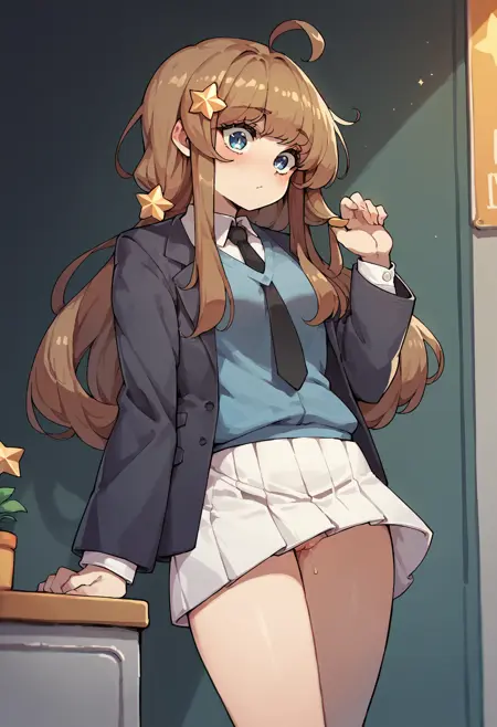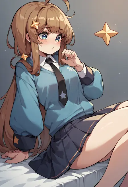 태그: 1girl, solo, darly(djmax), 갈색 머리, 긴 머리, 파란 눈, 별(기호), 아호게, 셔츠, 넥타이, 치마, 별 머리 장식, 긴 소매, 비즈니스 정장