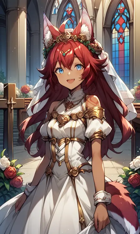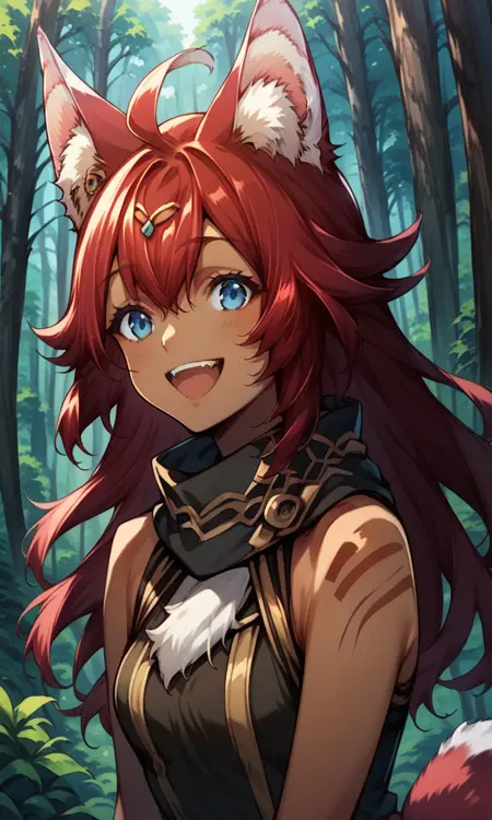 Fuuka, dark skinned female, red hair, long hair, blue eyes, animal ears, tail
