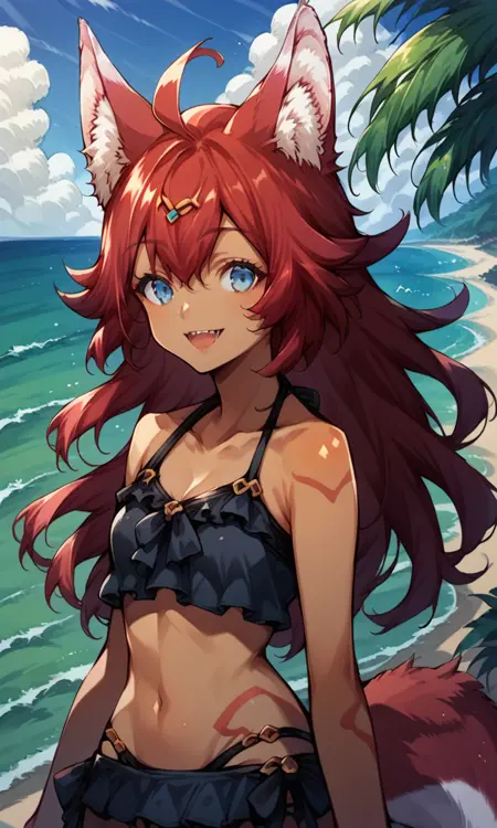 Fuuka, dark skinned female, red hair, long hair, blue eyes, animal ears, tail
