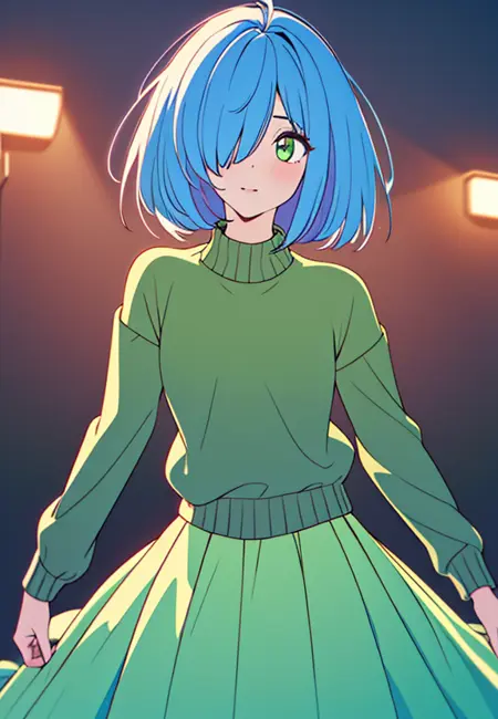 hair over one eye, medium hair, green sweater, striped sweater, long skirt, blue boots