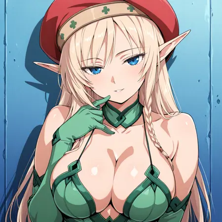 アクティベーションタグは「alleyne」、衣装タグは「elf, pointy ears, blue eyes, hat, beret, braid, blonde hair, large breasts, long hair, side braid, green footwear, cape, thighhighs」です。