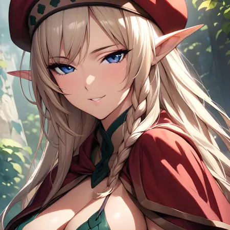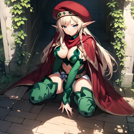 활성화 태그: "alleyne", 의상 태그: "elf, pointy ears, blue eyes, hat, beret, braid, blonde hair, large breasts, long hair, side braid, green footwear, cape, thighhighs"