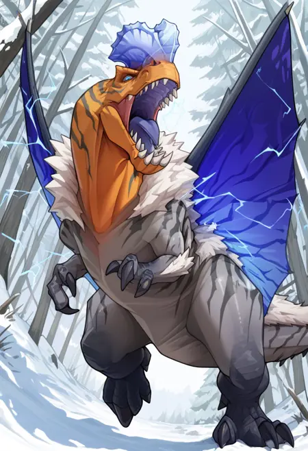 推荐正面描述:anjanath,黄色/蓝色*眼睛,无眼白,蓝色*鼻角**,蓝色*翅膀**,橙色头部*,条纹斑纹*,灰色身体*,蓝色嘴巴*