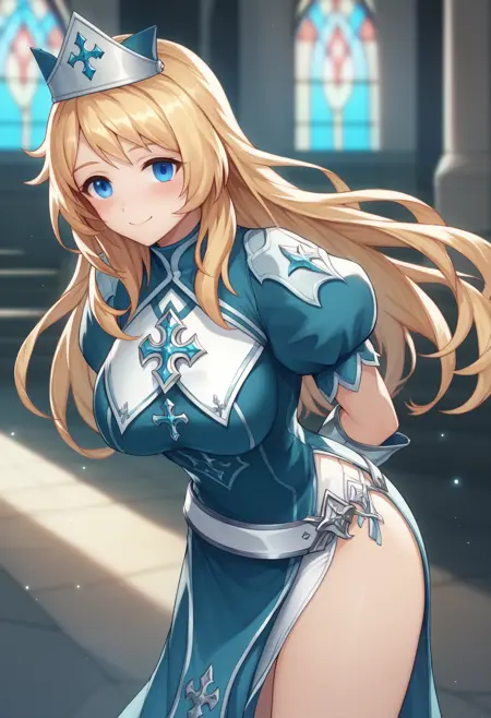 blue dress, high collar, puffy short sleeves, pelvic curtain, vambraces, belt, white skirt, skirt under dress, side slit, blue blue crown, ankle boots, high heel boot cross-laced footwear - her "default" outfit