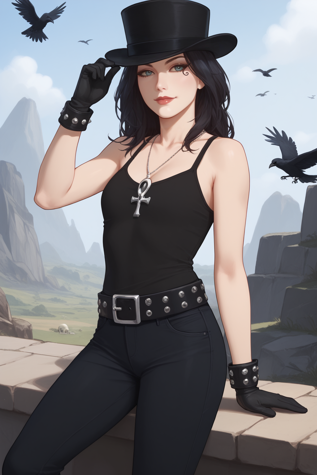 트리거: dethofend, 창백한 피부, 색상 있는 피부, 긴 머리, 눈 아래 문신, 안크 목걸이, 택스톱, 벨트, 바지, 장갑, 모자, 재킷
