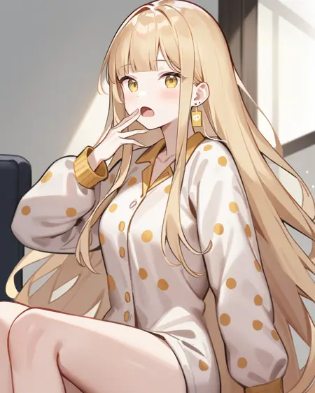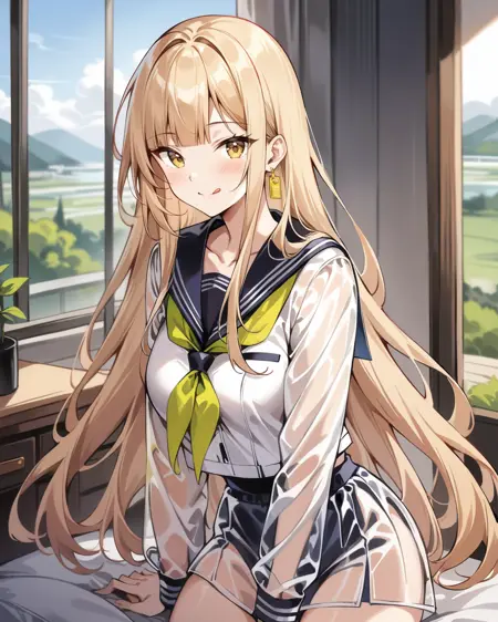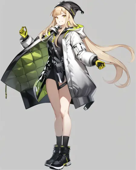 keluo,1girl,solo,long hair,gloves,hat,yellow eyes,jacket,beanie,long sleeves,black headwear,blonde hair,bangs,coat,open clothes,jewelry,hooded coat,hood down,earrings,shirt,very long hair,yellow gloves,white jacket,open coat,hood,white coat,