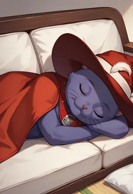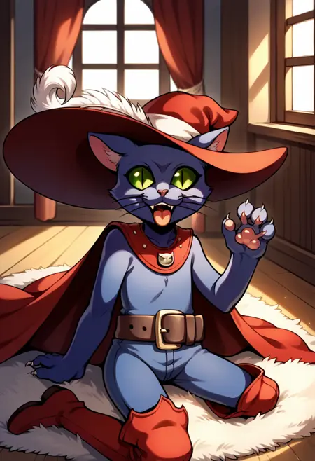 Default appearance: caitsith, cat boy, green sclera, slit pupils, red tricorne hat, hat feather, red cape, belt, thigh boots
