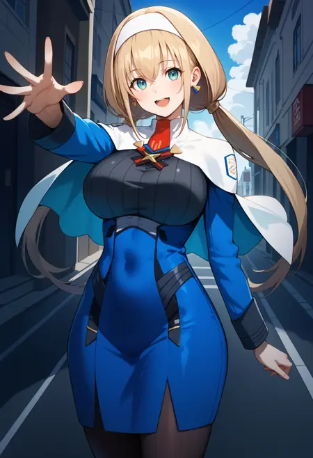 outfit11girl, solo, long hair, blonde hair, low twintails, white hairband, triangle earrings, large breasts, military uniform, white capelet, necktie, blue dress, long sleeves, black pantyhose