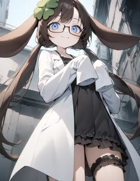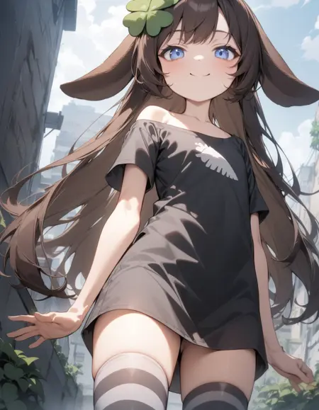 kiki, four-leaf clover hair ornament, lop rabbit ears, brown hair, long hair, bangs, blue eyes, flat chest,