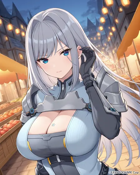 Recommended: 1girl, ethel \(xenoblade\), big breasts, long hair, grey hair, blue eyes, cleavage, armor, shoulder armor, cleavage cutout