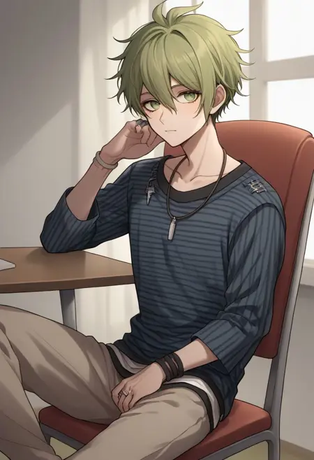 인과적: rantaro, 1boy, 녹색 머리, 단발, 앞머리, 녹색 눈, 셔츠, 줄무늬, 줄무늬 셔츠, 바지, 회색 바지, 보석, 목걸이, 반지, 쇄골,