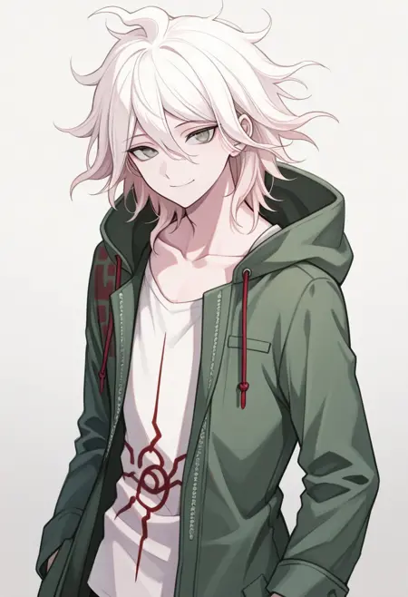 nagito, 1boy, 白发, 中等长度头发, 刘海, 灰色眼睛, 衬衫, 印花衬衫, 夹克, 绿色夹克, 连帽, 裤子, 黑色裤子, 衣服敞开, 锁骨,