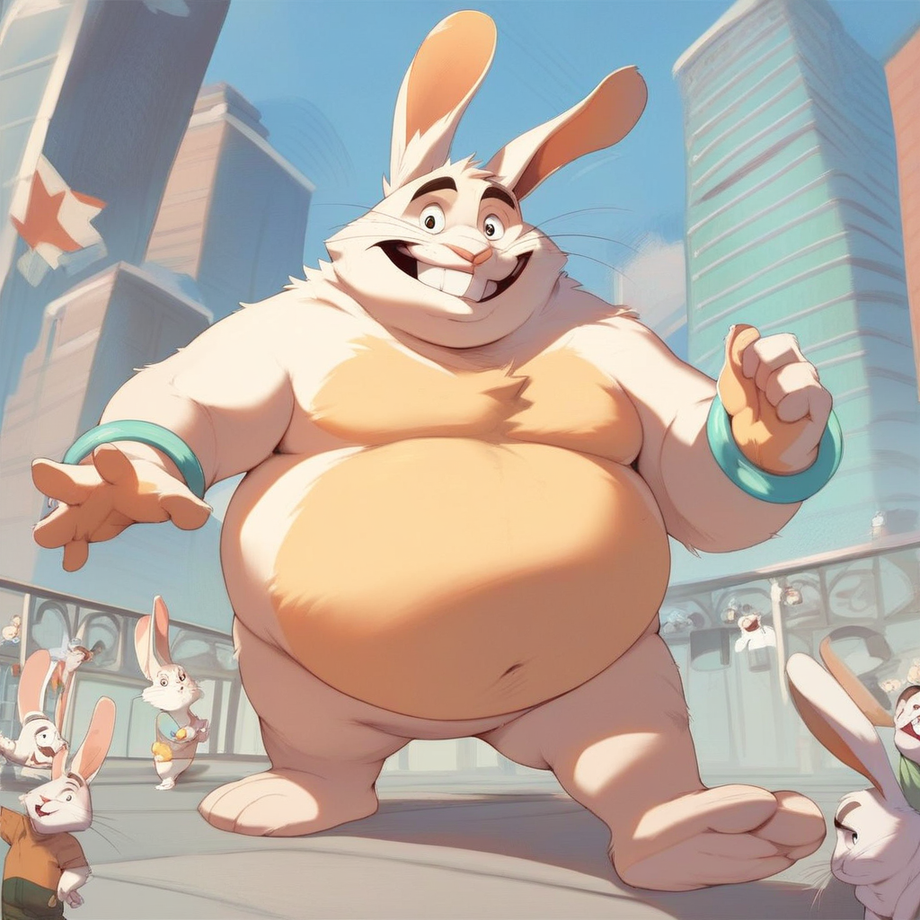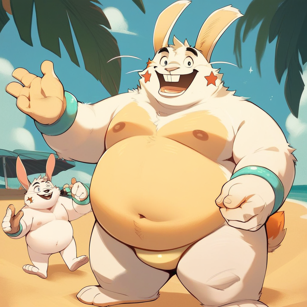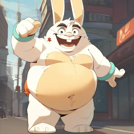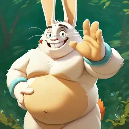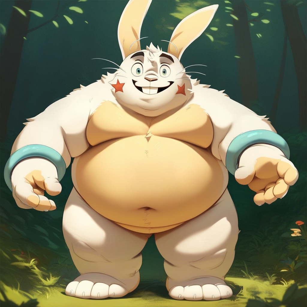 最良の正の入力: (rekkit, 太っている, 出っ歯、オレンジ色のふわふわした尾、青いブレスレット2つ、ひげ、ウサギ、ウサギの耳、ぽっちゃり、白い肌、黄色いお腹、右頬に赤い星、)