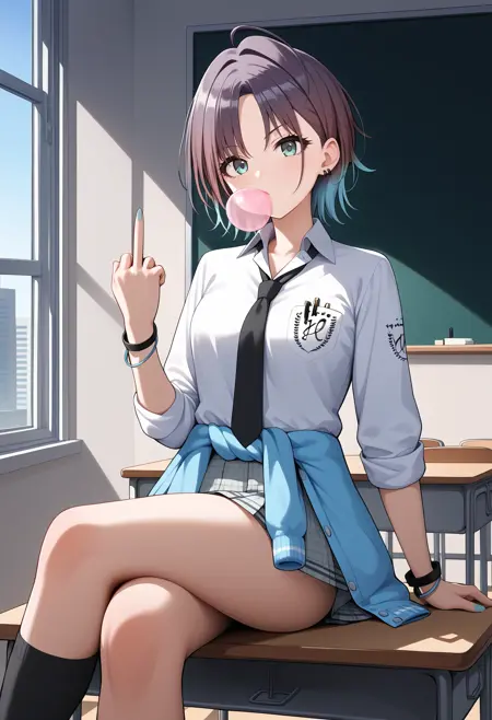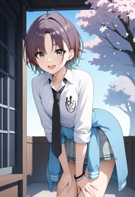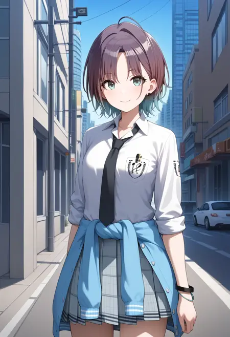 outfit1aatoru, short hair, gradient hair, ahoge, earrings, school uniform, black necktie, collared shirt, white shirt, sleeves rolled up, breast pocket, bracelet, clothes around waist, plaid skirt, grey skirt