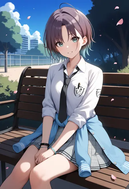 outfit2aatoru, short hair, gradient hair, ahoge, earrings, school uniform, black necktie, collared shirt, white shirt, sleeves rolled up, breast pocket, bracelet, clothes around waist, plaid skirt, grey skirt