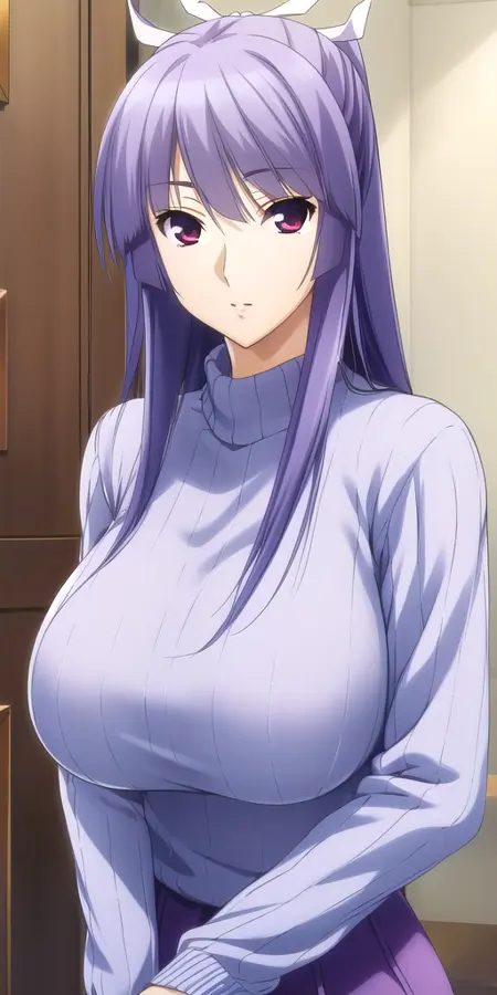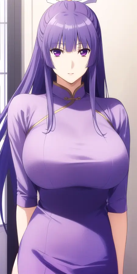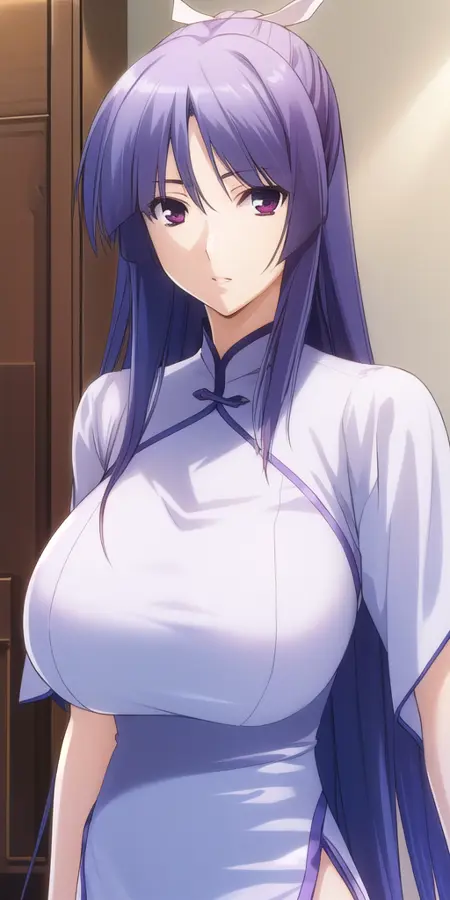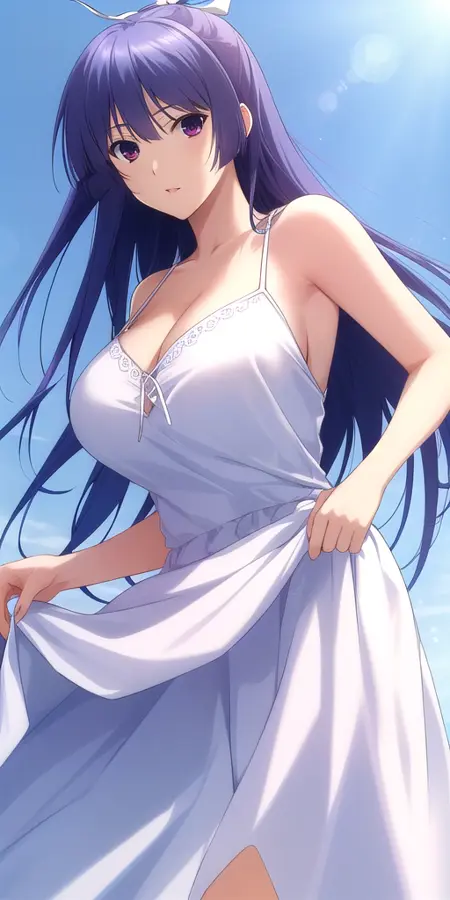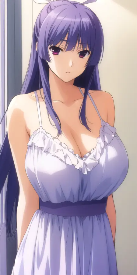Miko_White_kimono_Purple_hakama_skirt_Wide_sleeves_Purple_sash: Her classic modded miko outfit.