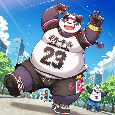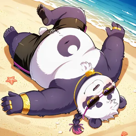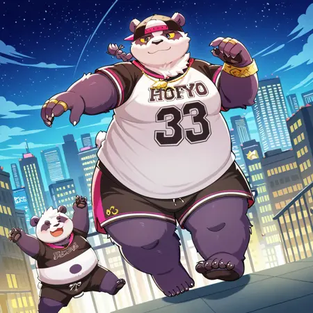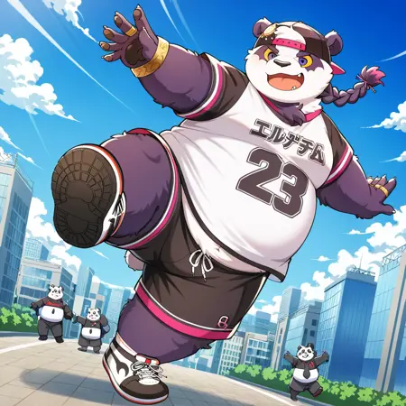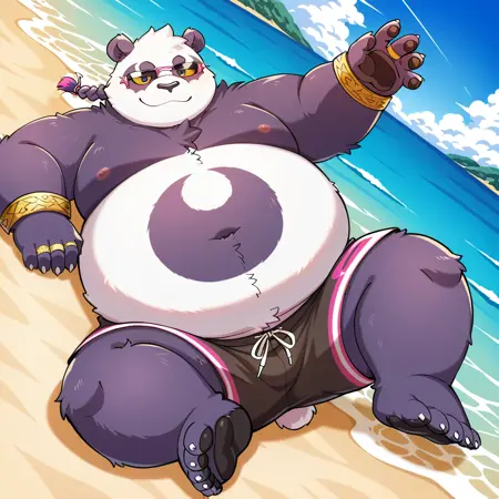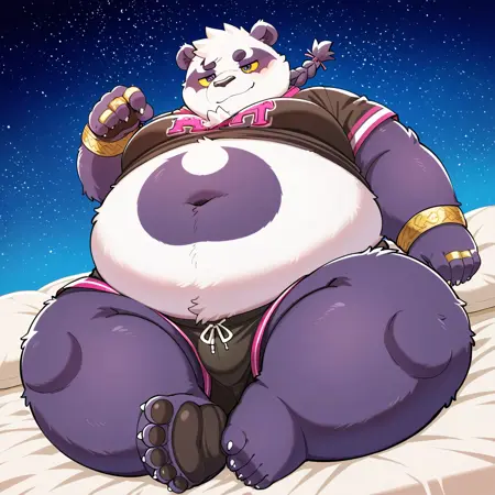 Best Positive Input: (alp, housamo, panda, bear, furry, fat, obese, purple and white skin, belly symbol, yellow sclera, purple eyes, wearing clothes, bracelets, rings, black soles, cap, braid,)