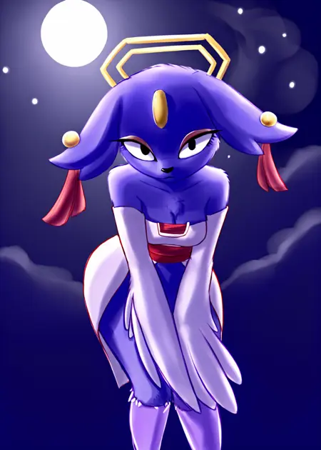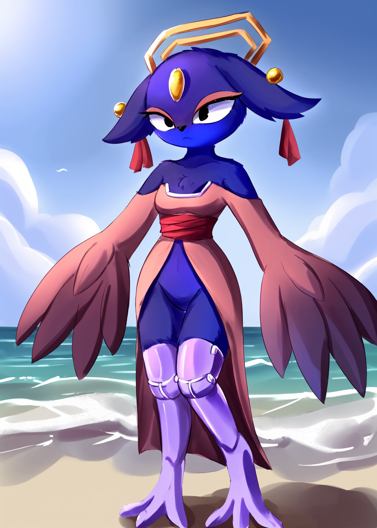 Recommended positive keywords: halo, feather hands, prosthetic leg, avian feet, long eyelashes, red eyeliner, kimono, slit dress, ear piercing ("collar" is available, but not trained well.)