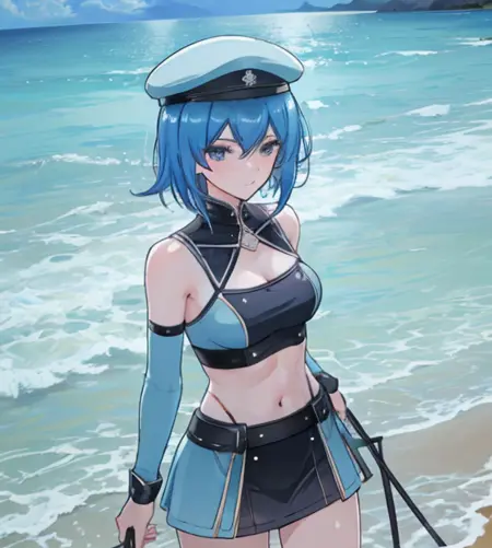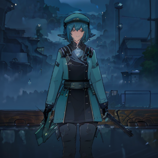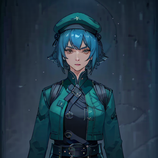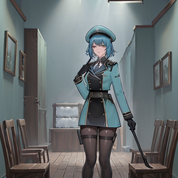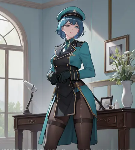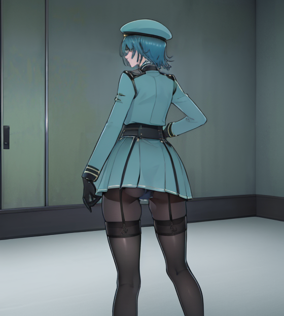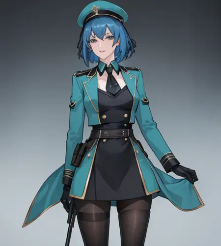 「警備員、軍緑色の制服、軍帽、タイツ、青い髪、短髪」