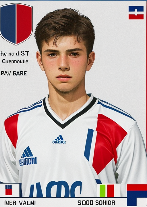 다음과 같은 토큰을 사용할 수 있습니다: 1boy, male focus, 스포츠웨어, 축구 유니폼, 영어 텍스트, 로고, 국기