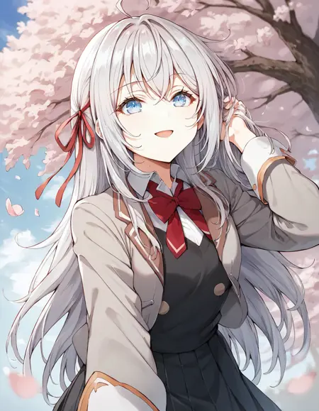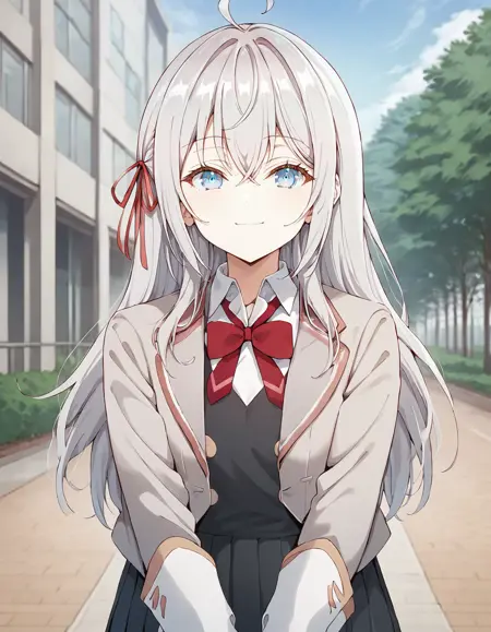 <lora:alisa_mikhailovna_kujou-roshidere_s1-ixl-anime-soralz:1>, alisa mikhailovna kujou (roshidere), long hair, silver hair, ahoge, crossed bangs, red hair ribbon, sidelocks, blue eyes