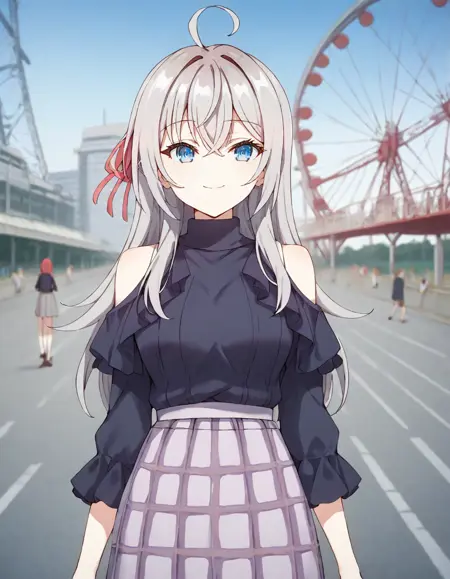 <lora:alisa_mikhailovna_kujou-roshidere_s1-ixl-anime-soralz:1>, alisa mikhailovna kujou (roshidere), long hair, silver hair, ahoge, crossed bangs, red hair ribbon, sidelocks, blue eyes