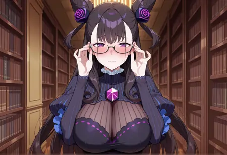 1번째: 긴 머리, 검은 머리, 보라색 눈, 더블 버니, 양쪽 위로 올린 머리, 머리 장신구, 드레스, 긴 소매, 볼륨 있는 소매, 장미, 프릴, 투명한 가슴 부분