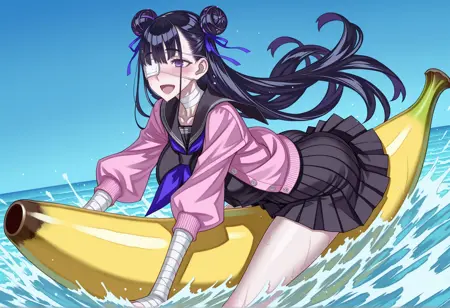 S2: 긴 머리, 검은 머리, 보라색 눈, 더블 버니, 안대, 의료용 안대, 머리 리본, 검은 세라푸쿠, 리본, 붕대, 붕대 감은 팔, 분홍색 자켓