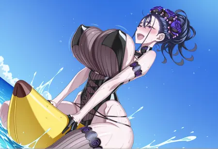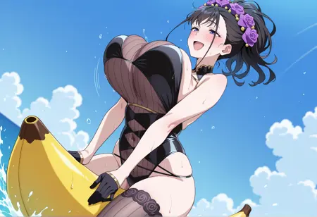 S1: 긴 머리, 검은 머리, 묶은 머리, 보라색 눈, 머리 꽃, 하이레그 수영복, 검은 원피스 수영복, 반장갑, 단일 허벅지 스타킹