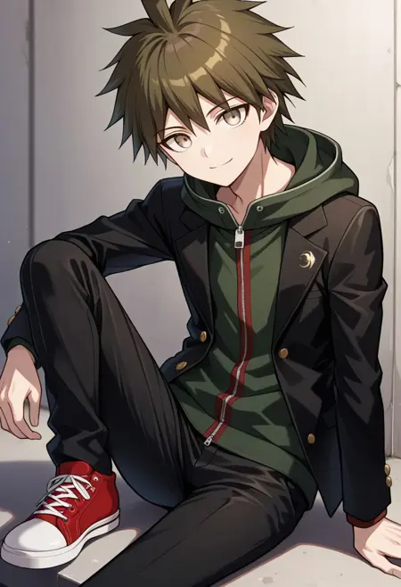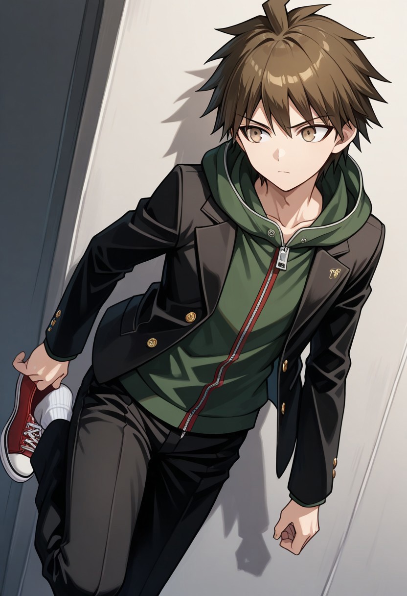 naegimakoto, 1boy, male focus, solo, brown eyes, brown hair, short hair, bangs, ahoge, hoodie, hood, green hoodie, zipper, zipper pull tab, jacket, black jacket, long sleeves, open jacket, open clothes, buttons, pants, black pants, shoes, sneakers, red footwear,