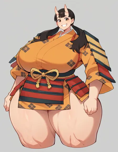 "inutadearmr, 日本盔甲, 低双马尾, 和服, 鬼, 露齿笑, 黑发, 棕眼, 盔甲"