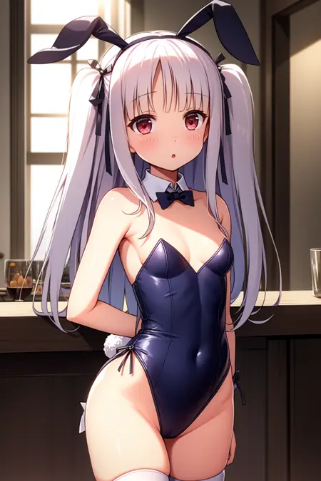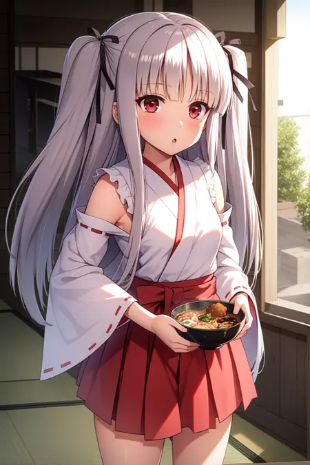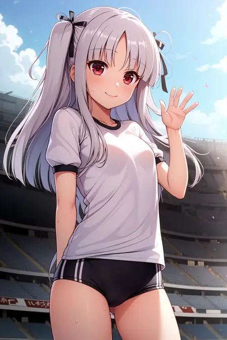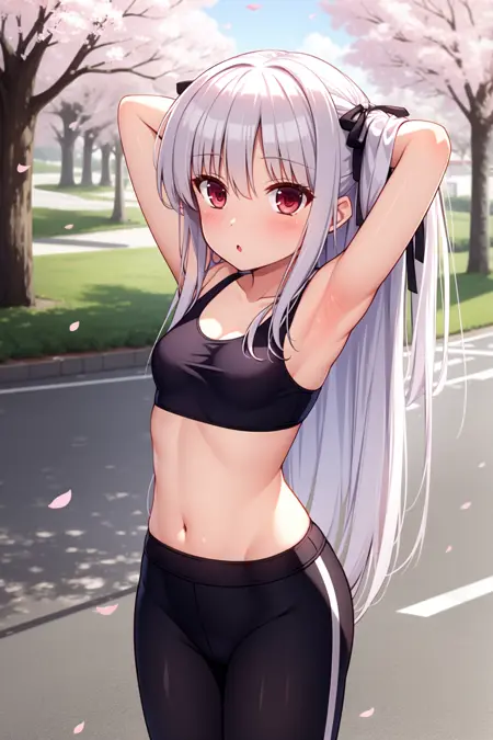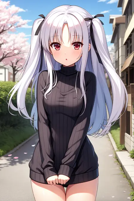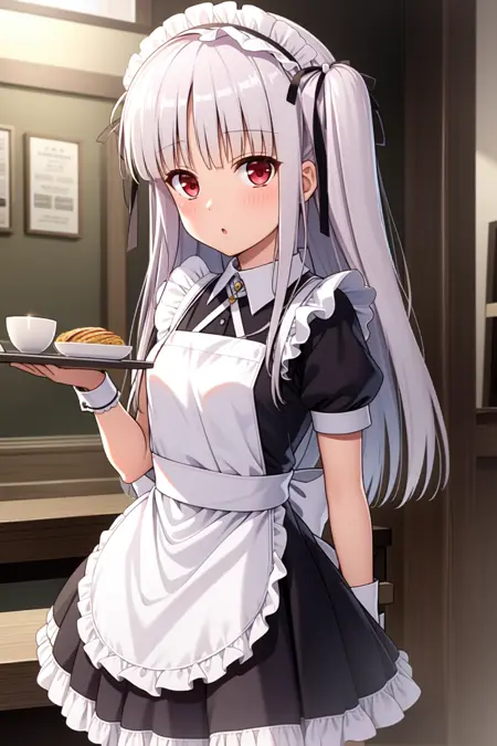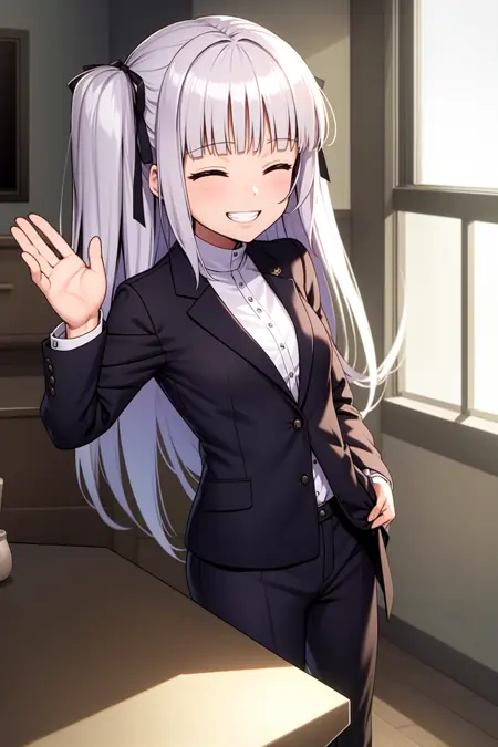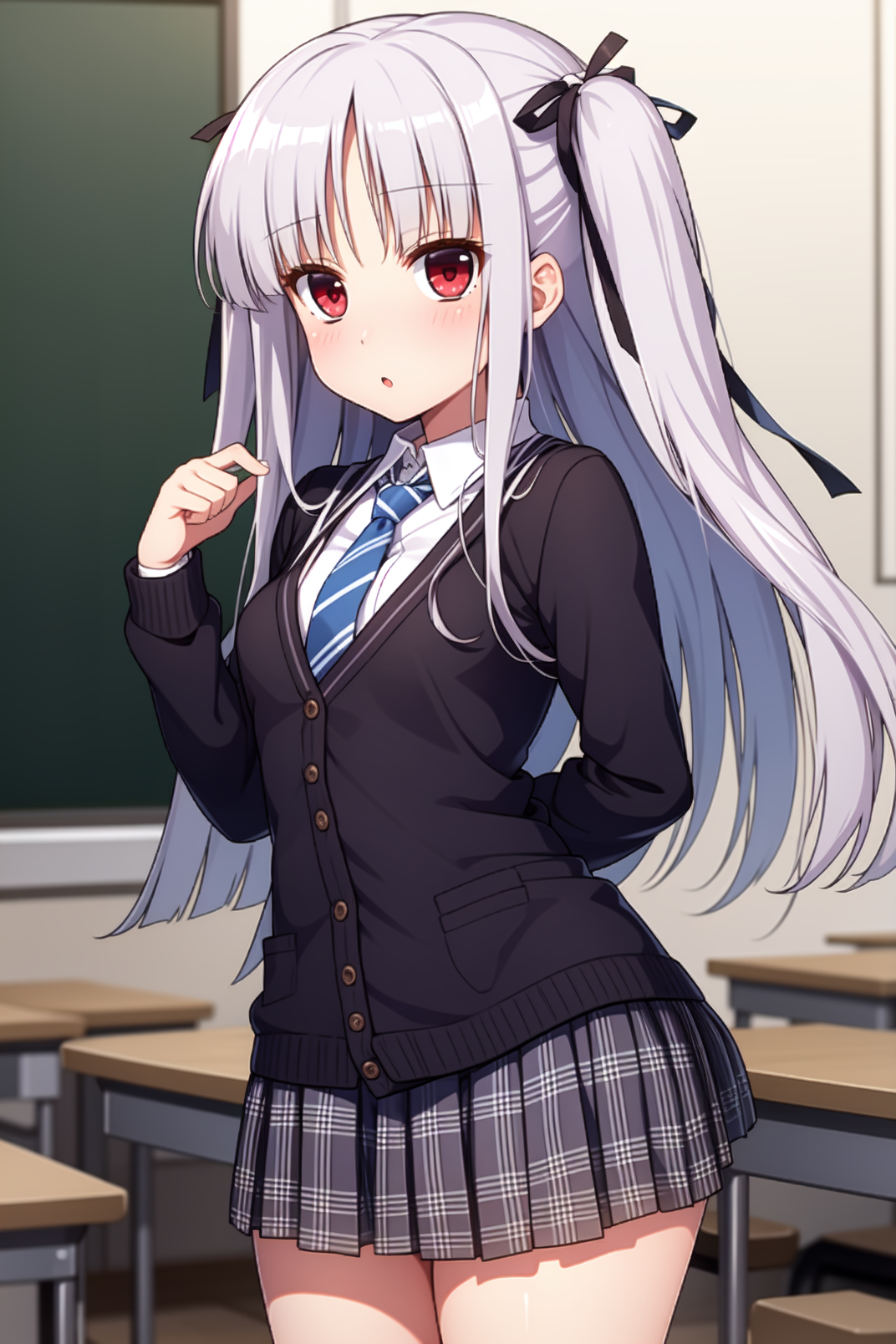 外見:ジュリー、赤い目、灰色の髪、長い髪、両サイドアップ、 blunt バン、髪リボン、黒いリボン