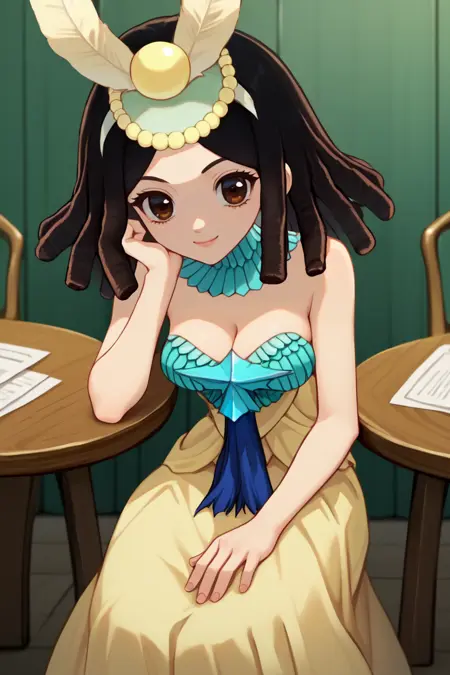 彼女の典型的な外見には、「ヘアアクセサリー、取り外し可能なカラー、ストラップレスドレス、ロングドレス、セクシーな胸元」を追加してください。