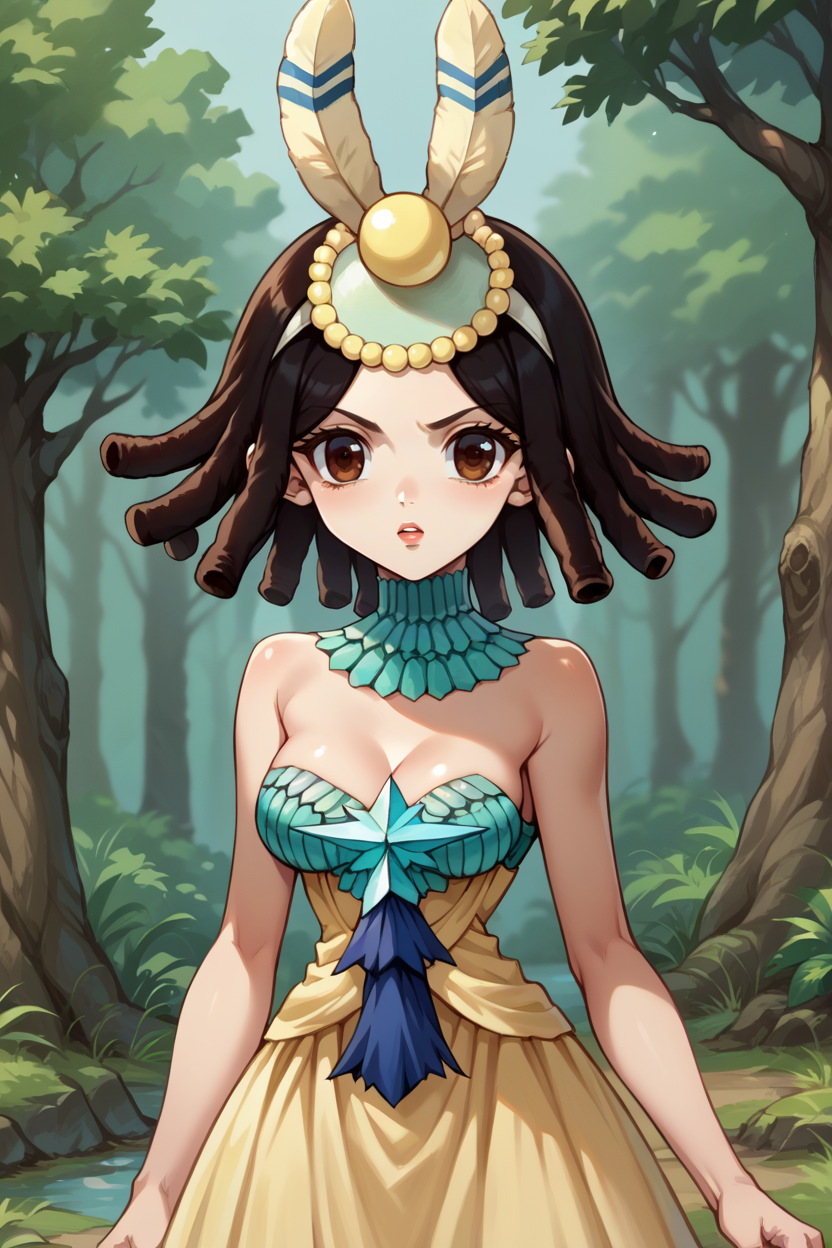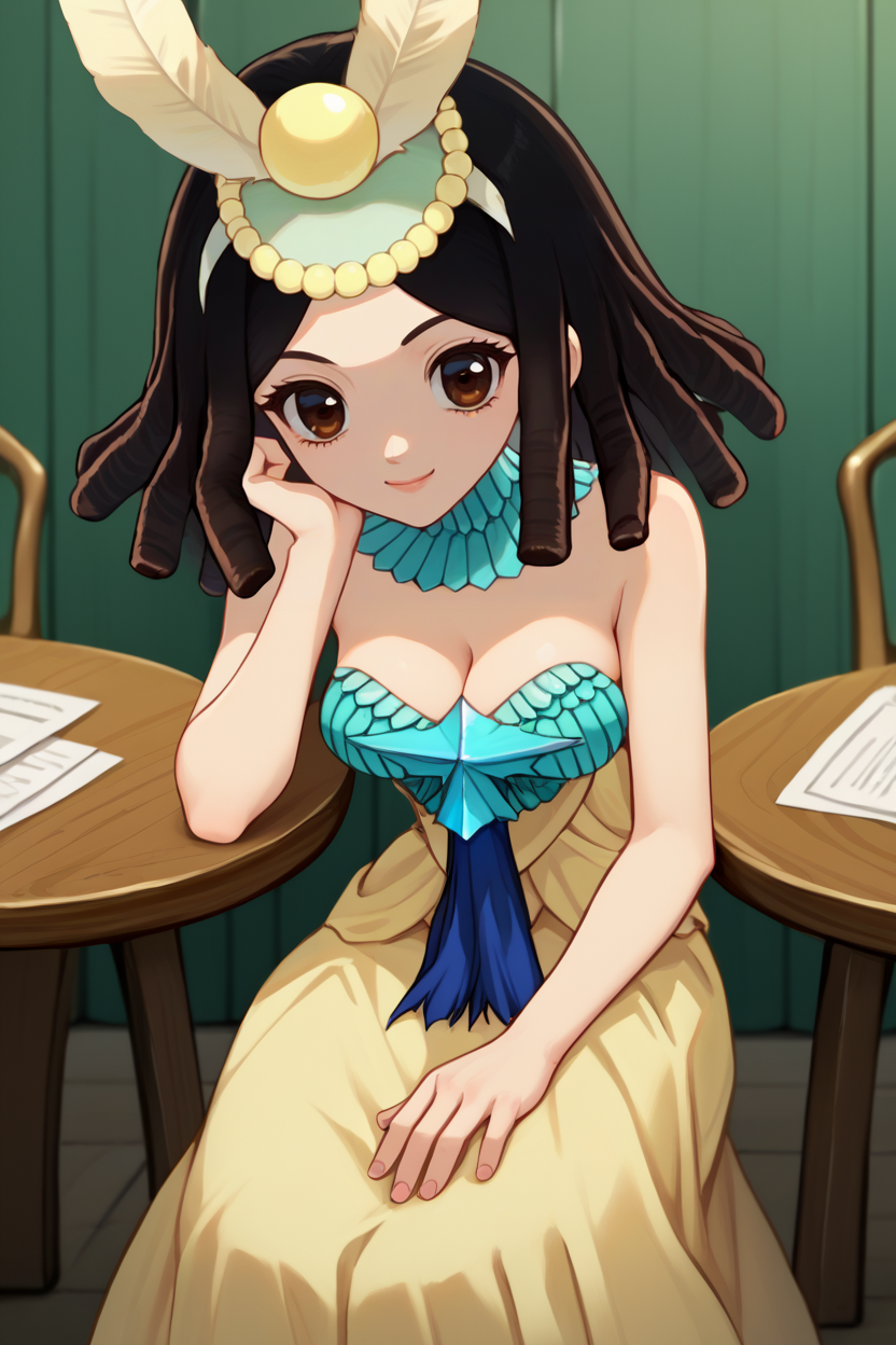 그녀의 전형적인 외모를 위해 "머리 장식, 분리형 칼라, 스트랩 없는 드레스, 긴 드레스, 가슴 노출"을 추가하세요.