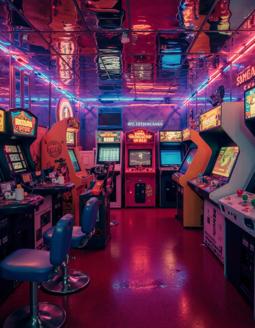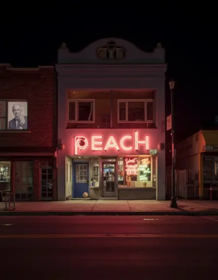 • "peach"라고 쓰인 네온사인을 달은 상점 입구를 franck-bohbot 스타일로 촬영한 사진