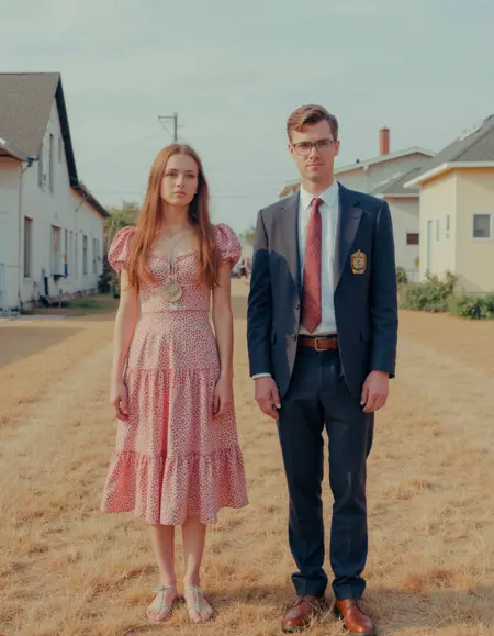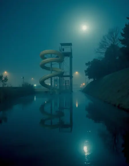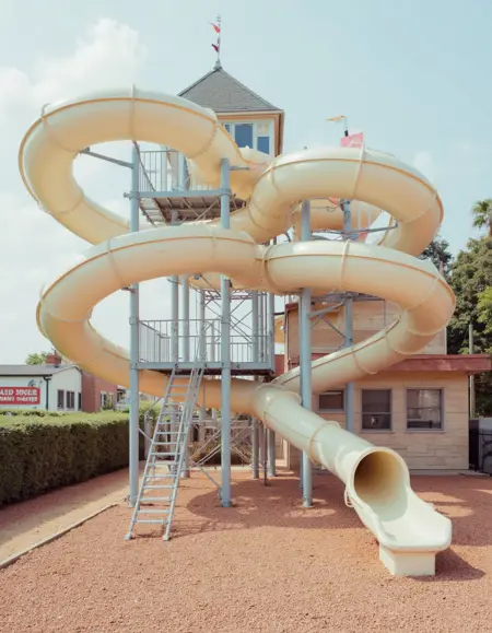 • 워터슬라이드 앞에 서 있는 남성과 여성을 franck-bohbot 스타일로 촬영한 사진