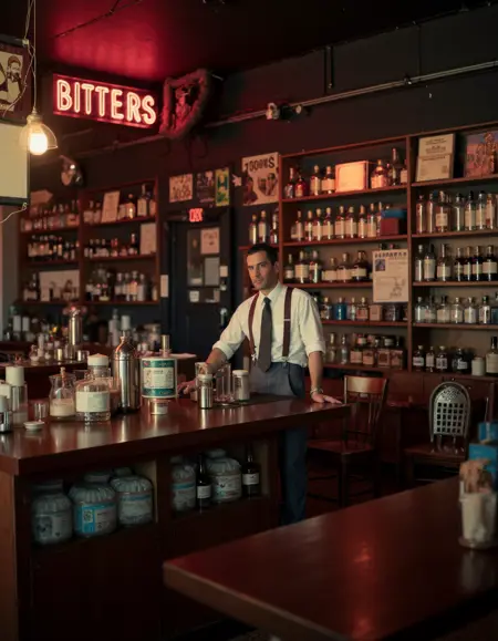• 바와 녹색 의자가 있는 레스토랑을 franck-bohbot 스타일로 촬영한 사진