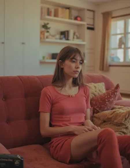• 레스토랑에서 테이블에 앉아 있는 여성을 franck-bohbot 스타일로 촬영한 사진