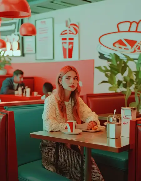 一张女性坐在餐厅桌子旁的图片,采用franck-bohbot风格