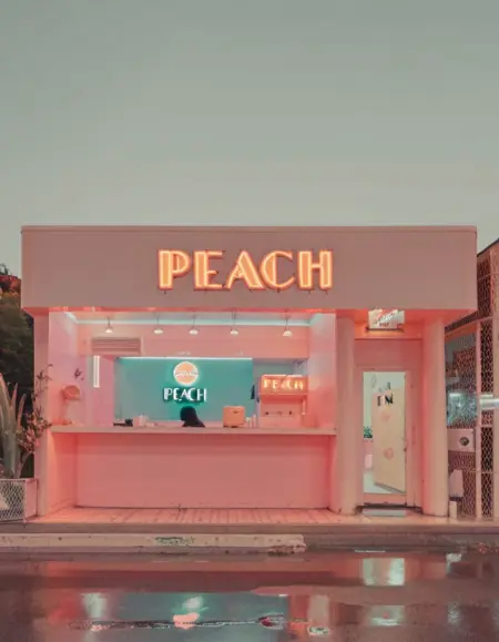 一张商店门面,带有写着“peach”的霓虹灯招牌的图片,采用franck-bohbot风格