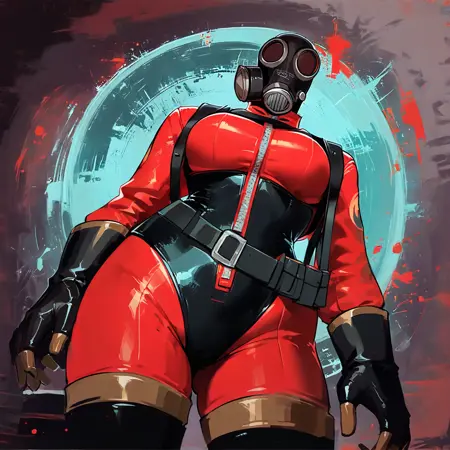 ガスマスク、ヘルメット、黒レオタード、赤い乳房、ショルダーストラップ、手袋、太ももブーツ、ベルトポーチ、ジッパー、赤い袖、赤いボディスーツ、背中のシリンダータンク