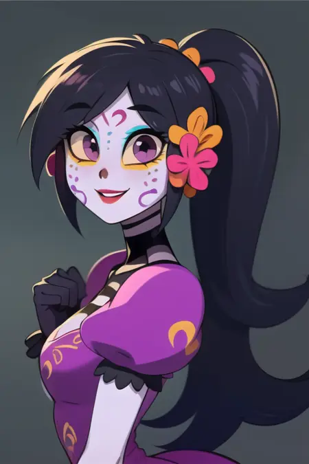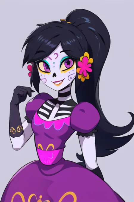 Catalina la catrina, black hair, ponytail, yellow sclera, hair ornament, hair flower, purple eyes, makeup, facial mark, bodypaint
