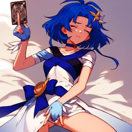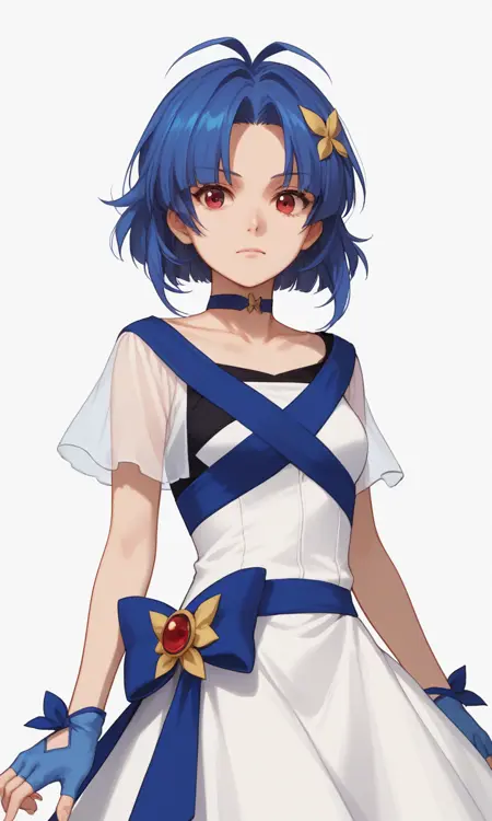 アイドル衣装:ブルー・ホワイトのドレス、フィンガーレスグローブ、チョーカー、リボン、ブルーのグローブ、ドレス