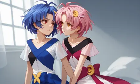 Luna&Amu: Luna&Amu、Luna、Amu、2girls、複数の女の子、青い髪、赤い目、ショートヘア、ヘアアクセサリー、アンテナ髪、ピンクの髪、ショートヘア、黄色い目、ヘアアクセサリー、