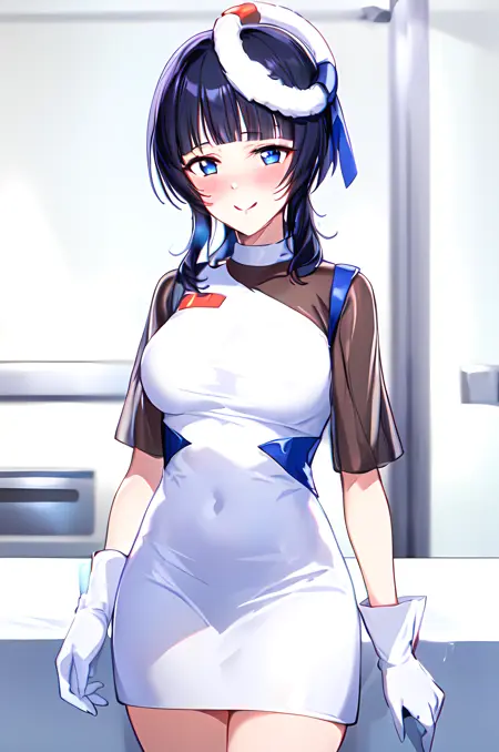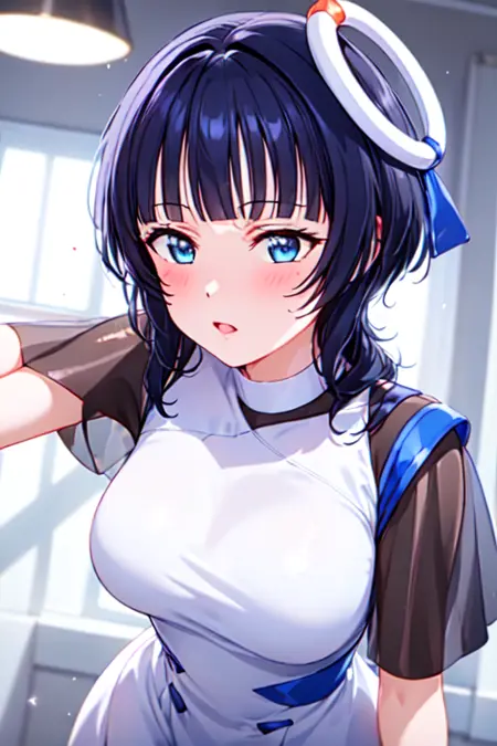 asaka karin, eternal_light, 앞머리, 검은색 머리, 파란색 눈, 둔한 앞머리, 짧은 소매, 얼굴 빨개짐, 흰색 드레스, 흰색 머리 장식, 흰색 장갑