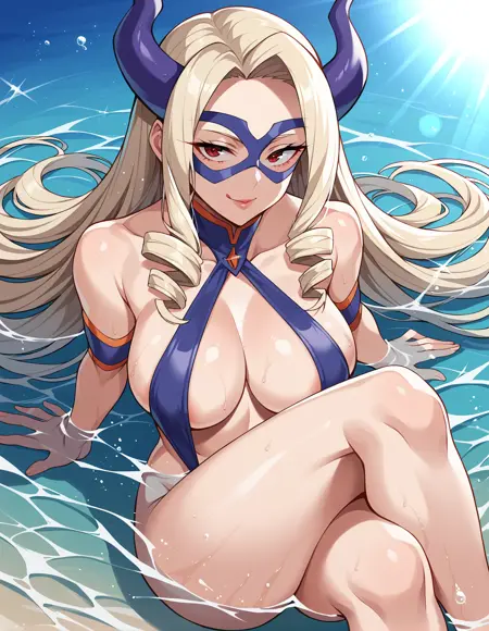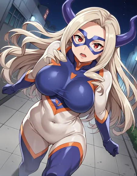 トリガー語: mount lady, 1girl, long hair, drill hair, blonde hair, red eyes, purple horns, large breasts, mask, domino mask