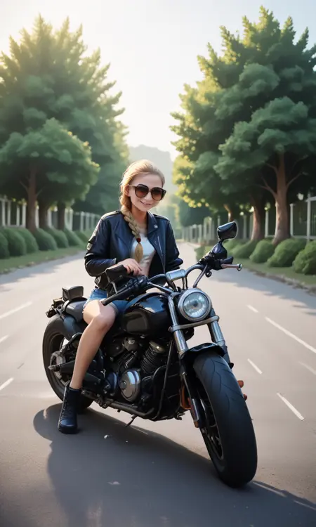 sitastmo, (side view)++++ , 검은색 오토바이에 앉은 마른 소녀, 짧은 핫팬츠와 상의, 긴 금발 머리