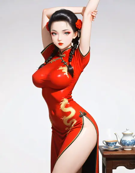 old-shanghaibeauty, 1girl, realistic, red lips, lipstick, looking at viewer, makeup, { red | white | black | purple | pink | yellow | navy blue } chinese clothes,side slit, eyeshadow,